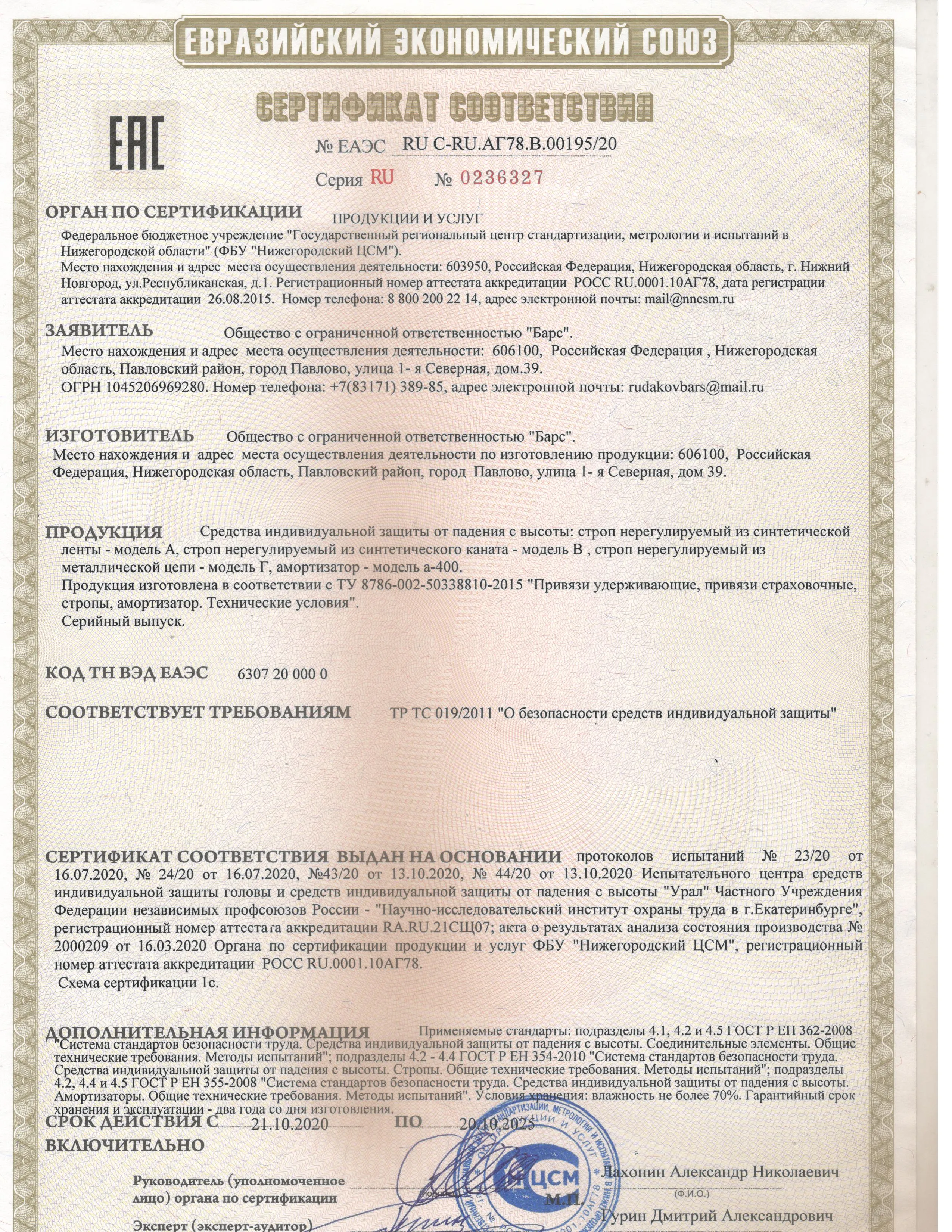 Весь обвес (карабины, пряжки и прочее металлическое) - это собственное производство и на всё это тоже есть сертификаты.